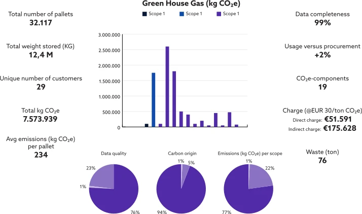The second part of the project is a management dashboard. This part encompasses the 10 important dimensions of an emissions management dashboard: (1) Data completeness (2) Data quality (3) Usage versus procurement (4) Used components (5) Emissions per component (6) Carbon origin (7) Emissions per scope (1-2-3) (8) Total emissions emitted (9) Waste and (10) Expected direct and indirect carbon charge. With this intelligence, the manufacturer can identify the largest carbon sources and tailor reduction measures to the manufacturing process. As example, component suppliers are exchanged if they have a closer proximity to the facility (whereas costs alone wouldn’t have changed the decision) and residual heat of the plant itself is used to heat the warehouse, reducing the usage of natural gas to net-zero.