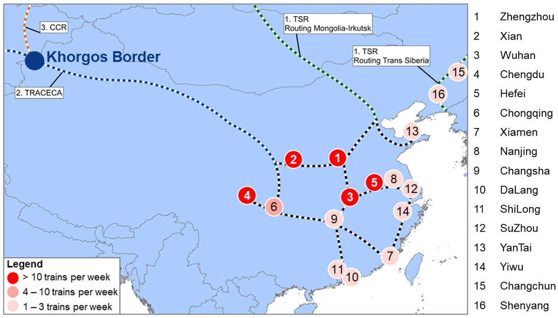 In China, about two-thirds of all rail shuttles in 2020 originated from three cities in inland China: Xi’an, Chongqing and Chengdu. These three cities are interesting centrally located rail hubs.